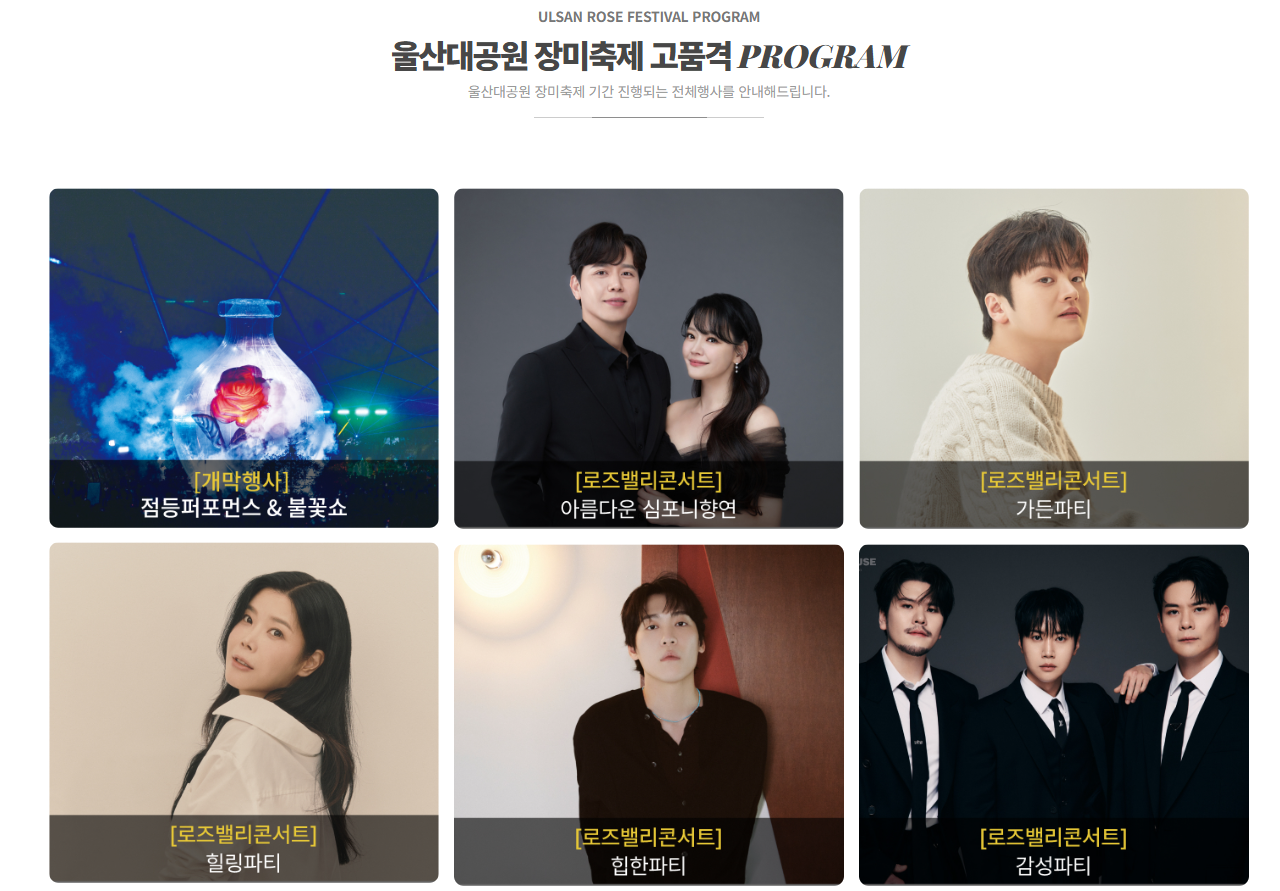 이번 축제는 정말 볼거리가 많아요! 개막 첫날인 21일에는 화려한 퍼레이드, 초대형 장미 조형물 점등식, 불꽃 쇼, 레이저 쇼가 준비되어 있고, 울산시립교향악단과 뮤지컬 배우 김소현·손준호 부부의 공연도 있대요. 와~ 개막식부터 이렇게 화려하다니 꼭 가봐야겠어요!