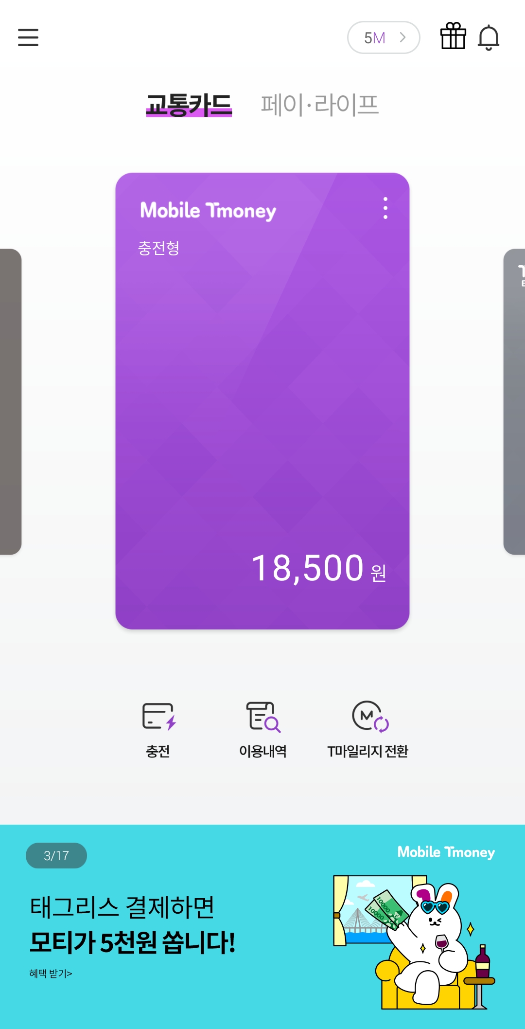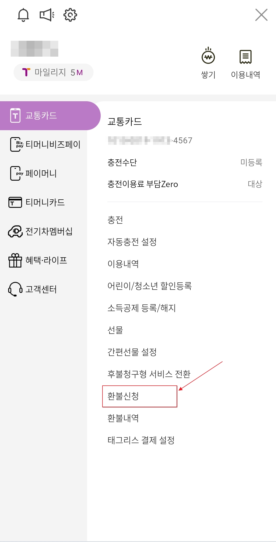 3. 티머니의 남은 잔액을 확인합니다.