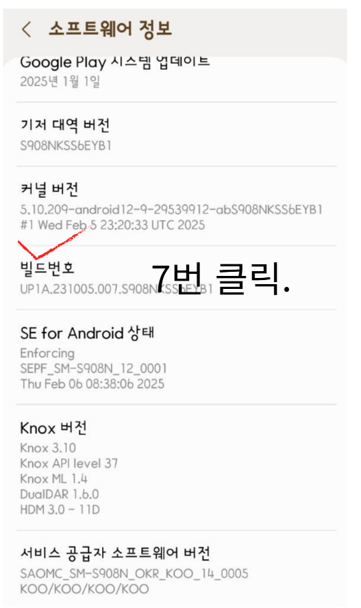 - 설정 → 휴대전화 정보 → 소프트웨어 정보 → 빌드번호(연속 7번 클릭)