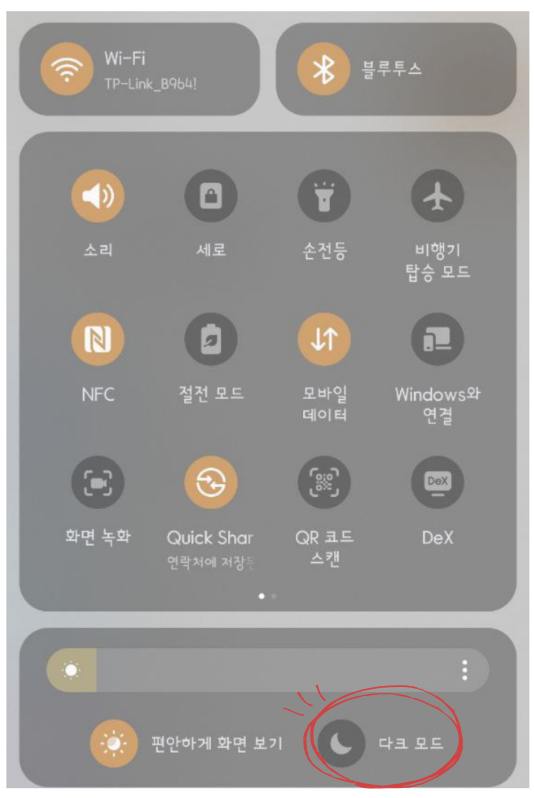 - 상단바를 아래로 내려서 다크 모드 아이콘 클릭