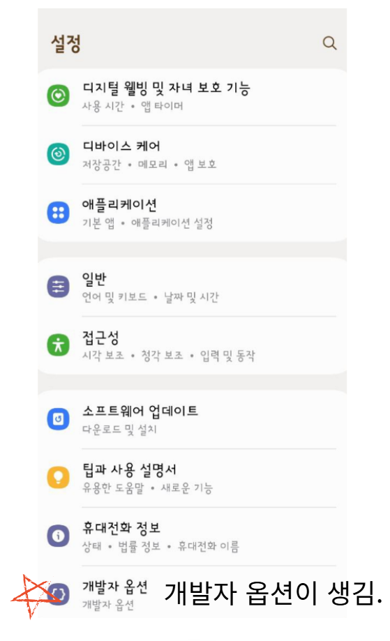 - 그럼 설정 맨 아래에 '개발자 옵션'이 생겨요!