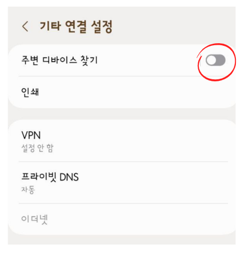- 설정 → 연결 → 기타 연결 설정 → 주변 디바이스 찾기(비활성화)